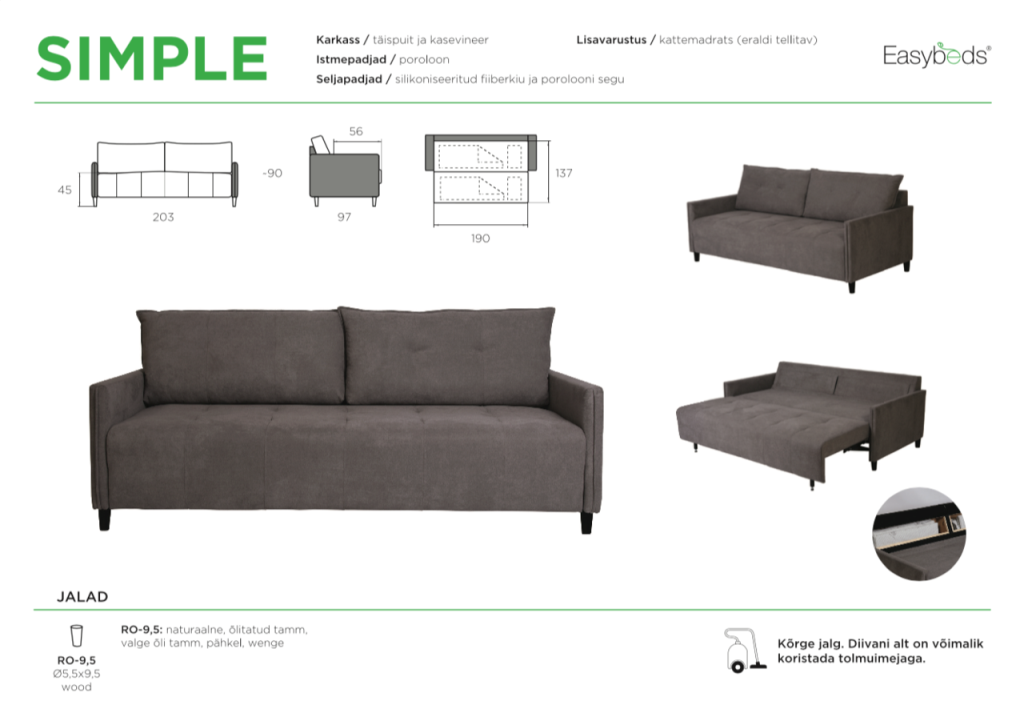 Diivanvoodi SIMPLE – juba nimi ütleb, et tegu on ühe lihtsa ja kauni diivanvoodiga. Kergelt avanev mehhanism, mugav istumisosa ja kaunid padjad – SIMPLE!