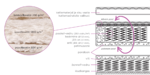 - Madratsi täidismaterjalina on kasutatud ühel pool lambavilla (200g/m²), puuvillavilti (1300g/m²) ja puuvillavilti (600g/m²). Teisel pool on kasutatud porolooni. Porolooniga madratsi pool on pehmem ja lambavillaga pool kõvem