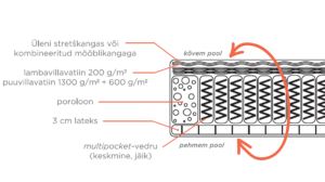 - Lisaks väga heale vedrustusele on madrats vooderdatud ühelt poolt puuvillavildi ja lambavillaga, teiselt poolt mugava 3 cm kliimalateksiga. (vt. ka pilti)