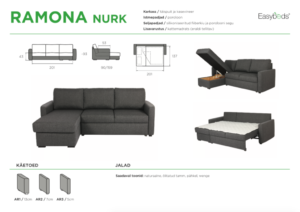 RAMONA nurgadiivanvoodi on stiilse välimusega, lihtsa süsteemiga ning kergesti lahtikäiv. Nurga all peidab ennast mahukas pesukast tekkide-patjade ja kõige muu jaoks. Mugav istumisosa ning magamiseks mõnus ruum.